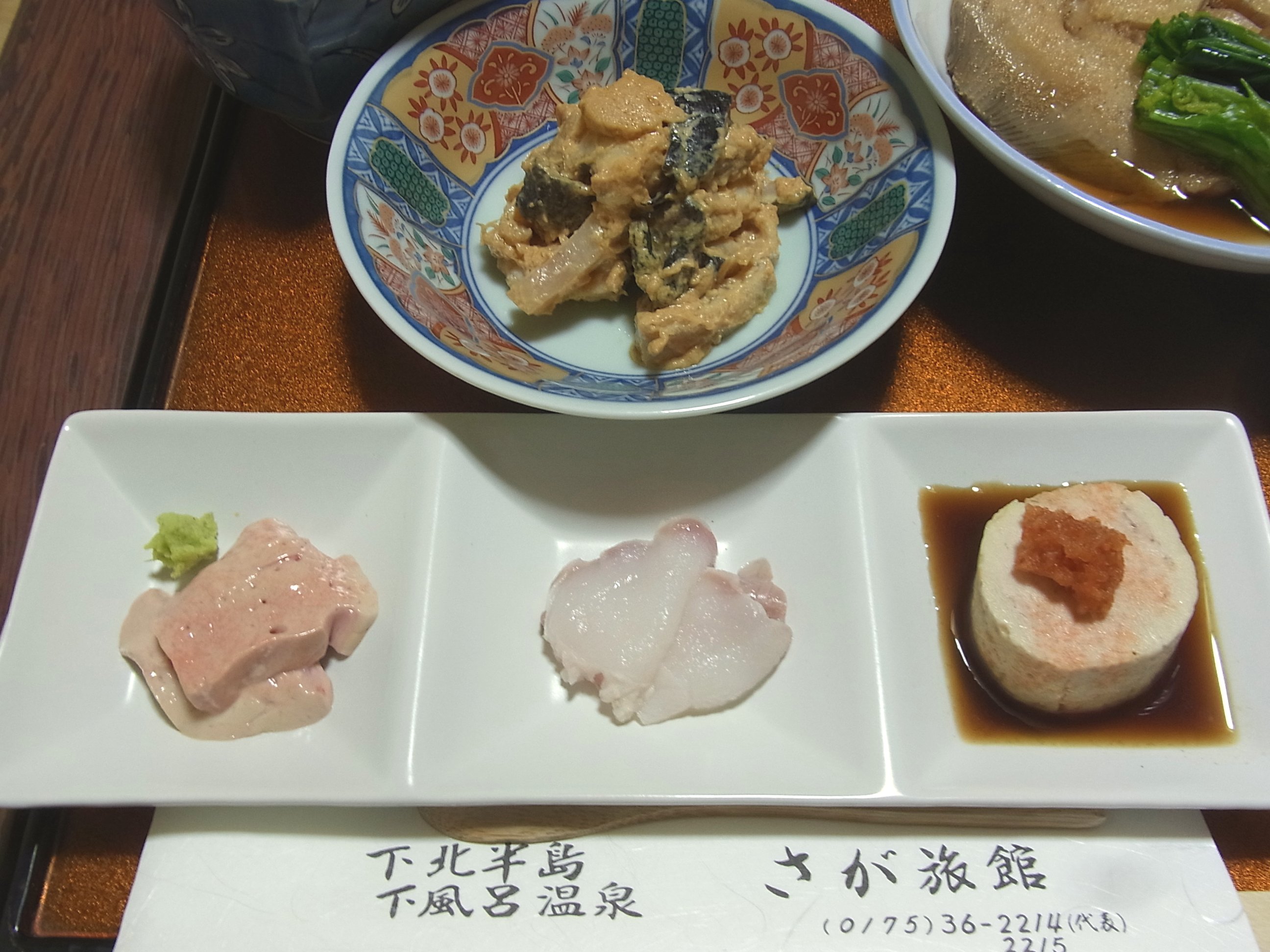 (左から、肝のお刺身・湯引き・蒸し肝、上のお皿は、とも和え)
