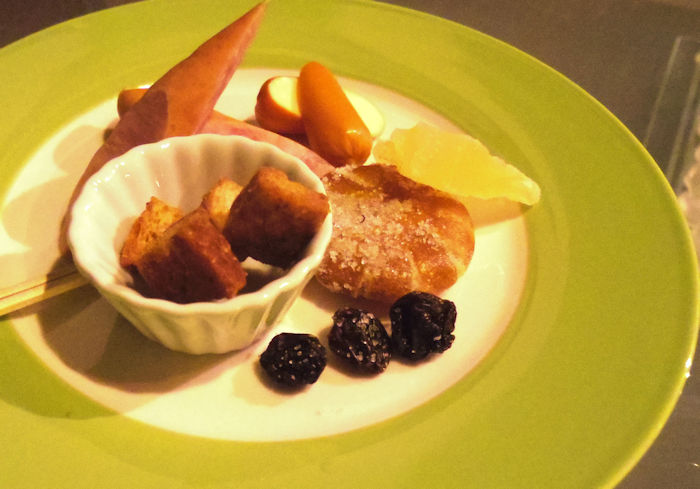 お通しはドライフルーツとソーセージやチーズの盛り合わせ。