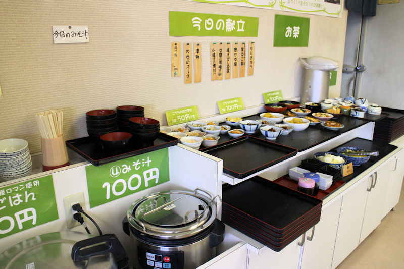 ごはん、味噌汁を自分で盛り おかずを選んでお会計して食べる