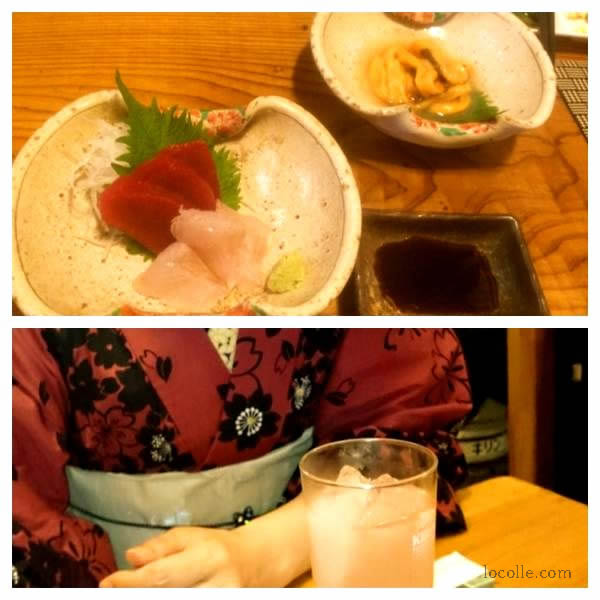 お通し、お刺身、串焼き2本の晩酌セットが1500円。