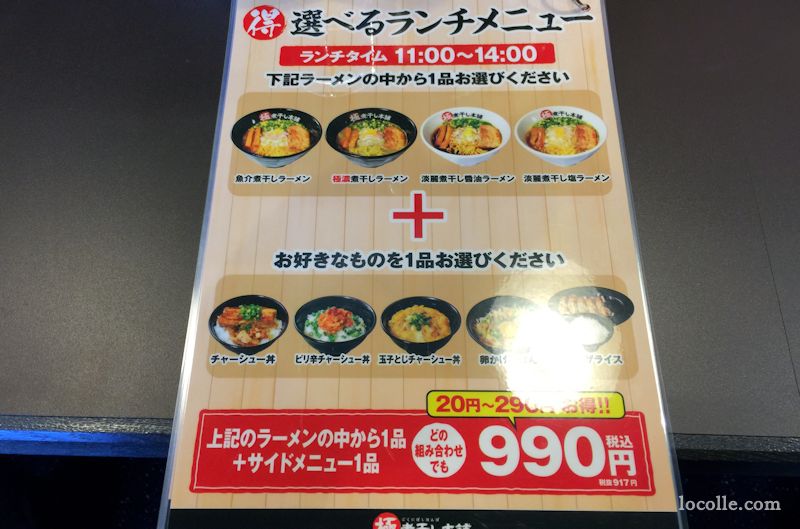 ランチメニューはラーメンにサイドメニュー1品付きで990円(税込)。