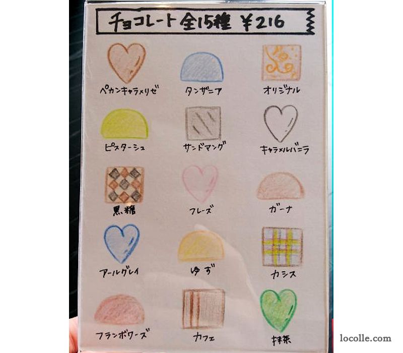 チョコレートは全て¥216で15種類。ショーケースは撮影NGだったので、こちらをご覧ください♪