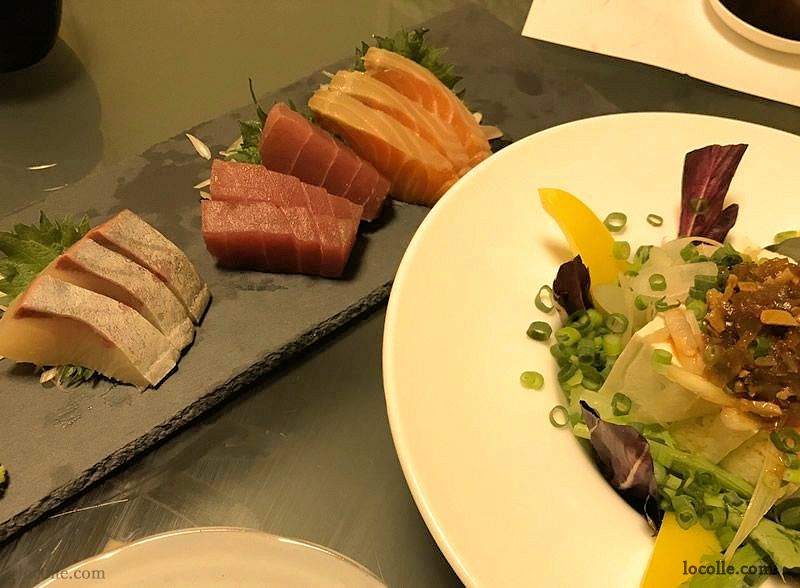 ということで、近海で採れた”本日のお刺身三点盛り”と、地元愛炸裂で”ピリ辛目屋豆腐サラダ”をチョイス。