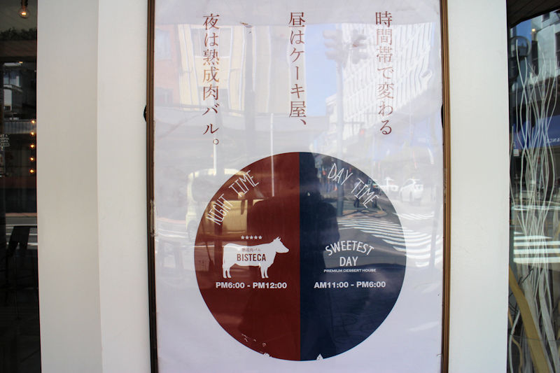 昼はケーキ屋、夜は熟成肉を提供する肉バルとして営業しています。