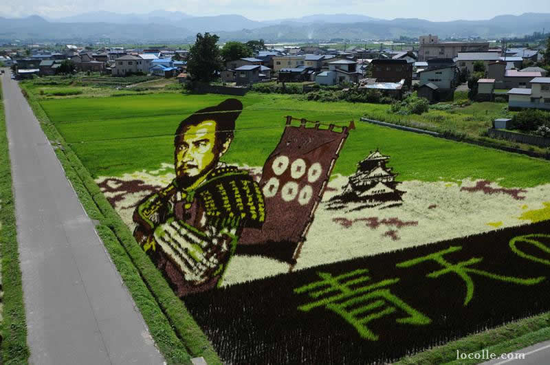 1.5ヘクタールの田んぼに描かれた二人の武将の姿が、勇ましく臨場感たっぷりに描かれています。