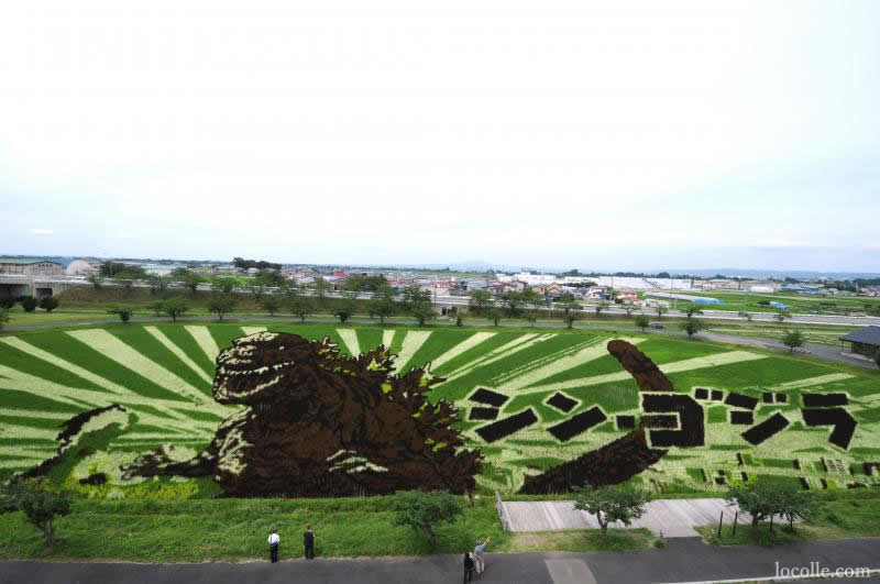横150メートル、縦80メートルの田んぼのキャンパスに描かれたゴジラの姿は圧巻。