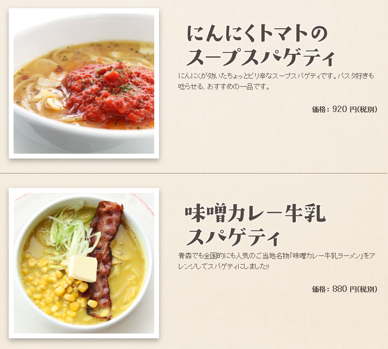 パスタも「にんにくトマト」や「味噌カレー牛乳」と興味深いメニューが。
