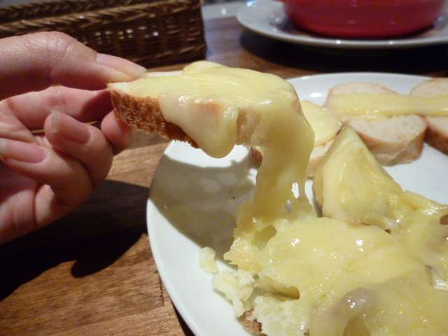そのチーズをじゃがいもとフランスパンの上にのせて頂きます。