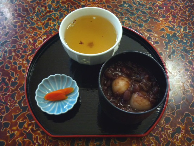 白玉ぜんざいには、そば茶と山ごぼうがセットでついてきます。