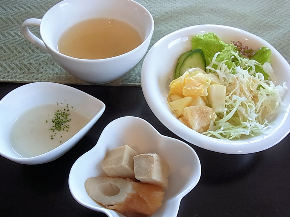 ランチタイムに行ったので、サラダ、小鉢2種、ドリンクつき。