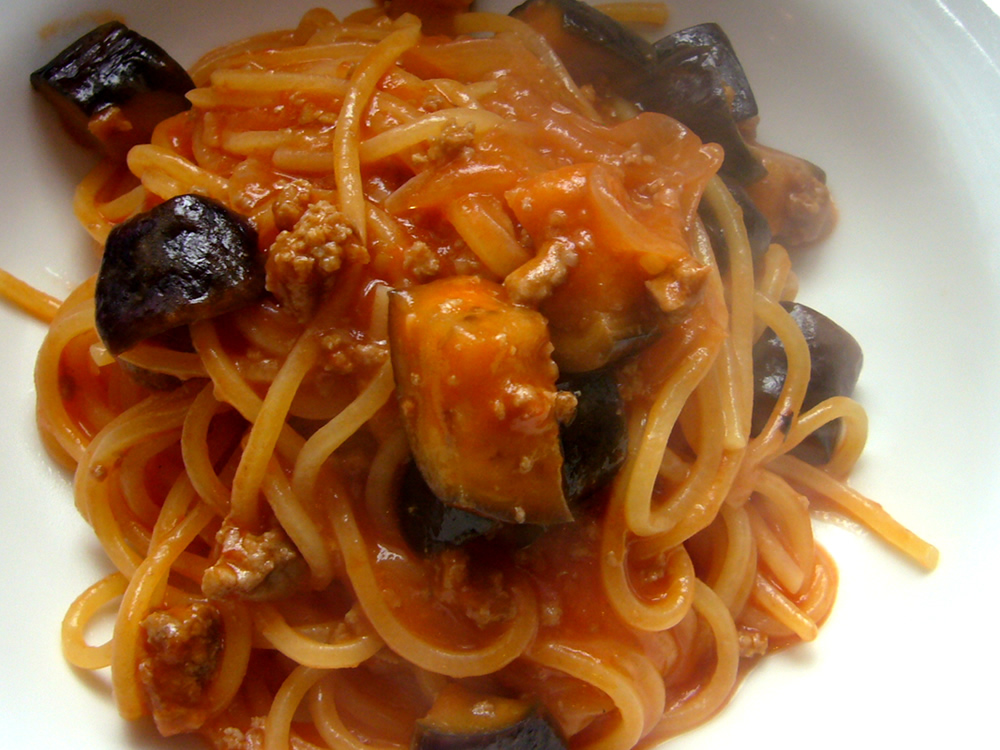 太目の生麺にごろごろと存在感のあるナスと挽肉と玉ねぎが絡んで、トマトソースがとても美味しく、生麺のもちもち感があり、食べ応えのあるボリュームでした。