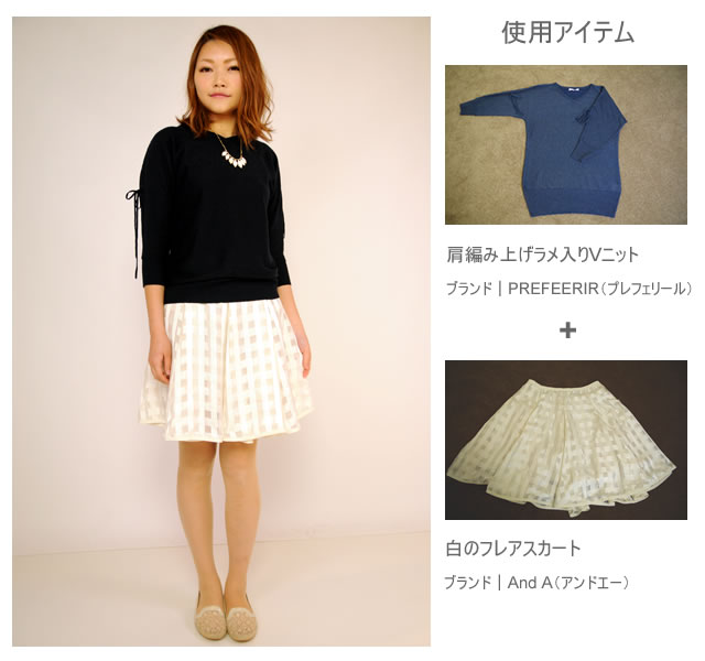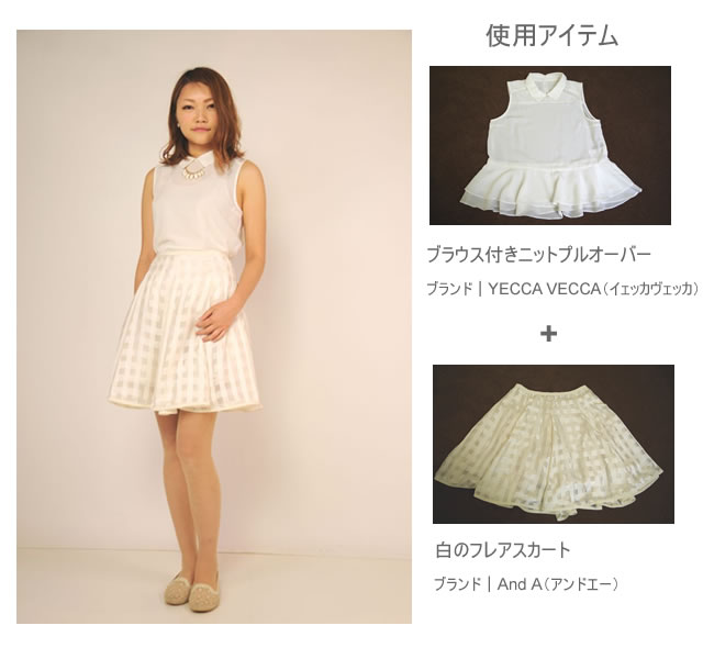 airClosetから「白のフレアスカートと合わせるとフェミニンに着こなしに」という