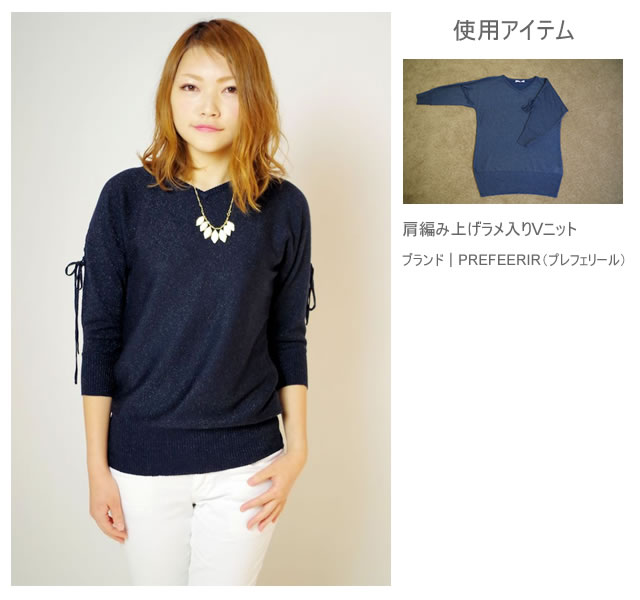 薄手のVネックニットは、白やベージュの明るい色のボトムに合わせると
