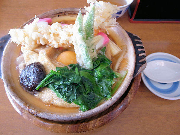 海老天、いんげんの天ぷら、鶏肉、かまぼこ、たまご、お麩