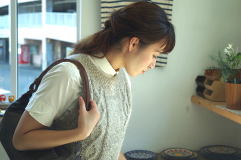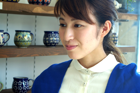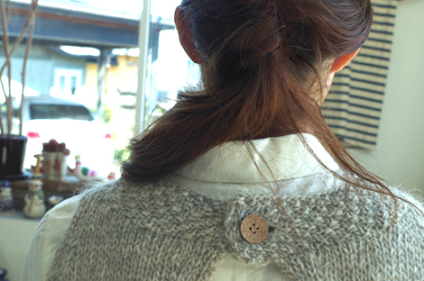無造作に束ねた髪から、コルクのボタンがチラリ。
