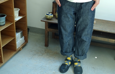 平織デニムのパンツは立体的な形が特徴。