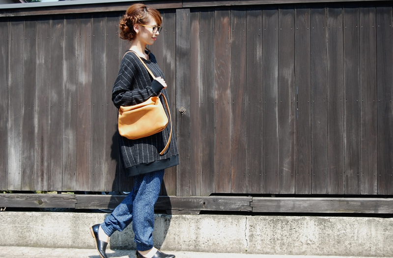 形が特徴的なショルダーバッグ。経年変化が楽しめる素材。