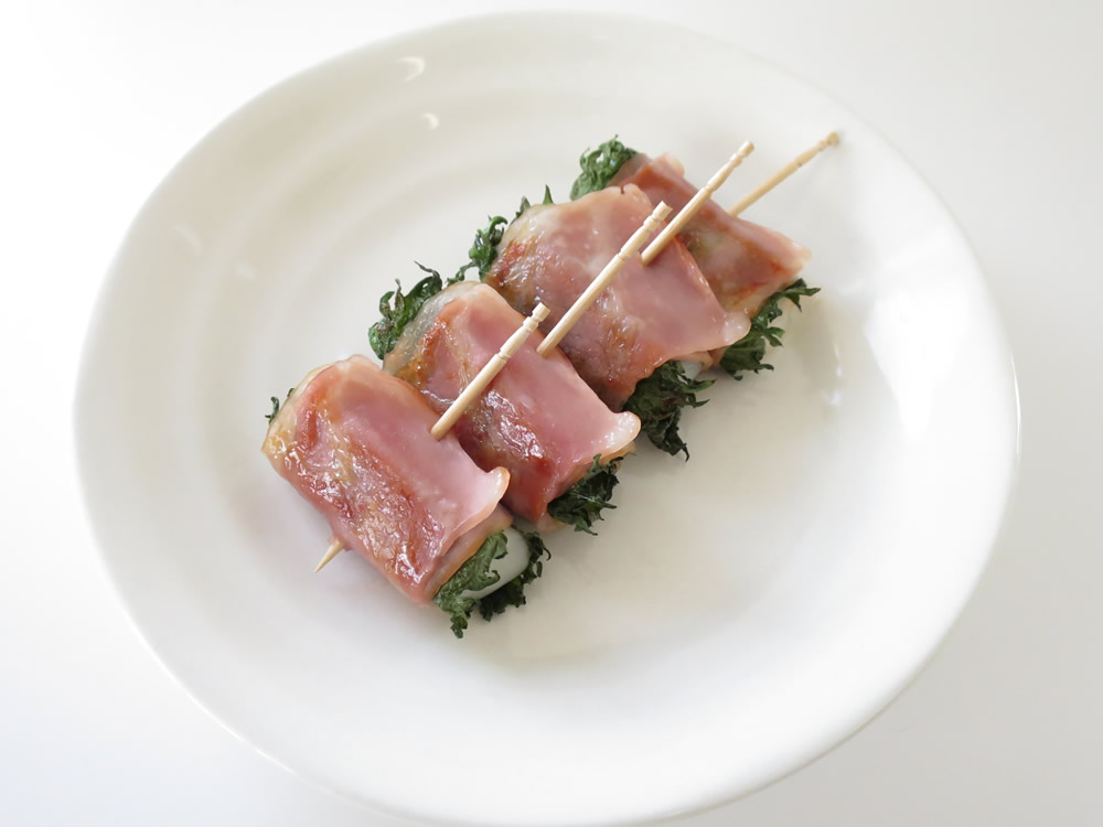 ベーコンの塩加減と青じその風味がきいてもちがまろやかに。