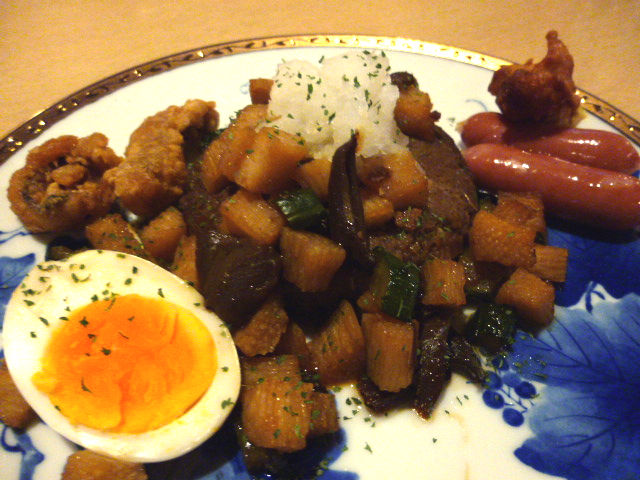 鶏とタコのから揚げ、ウインナー、ゆで卵に大根おろし。
