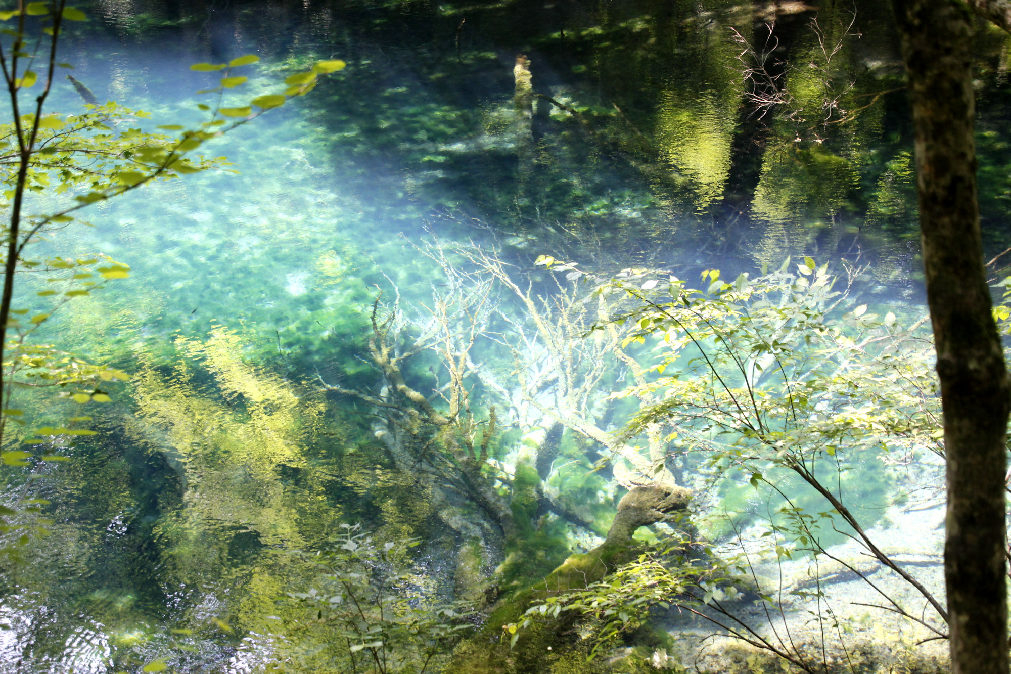 池の底が見えるほど透明で、所々がエメラルドのようにキラキラしています。