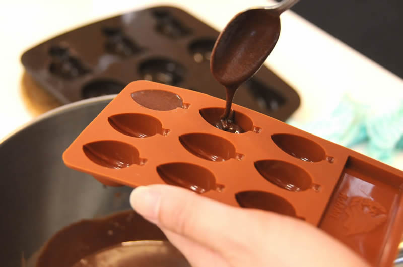 型枠にチョコレートを流し込み、冷蔵庫で固めます。