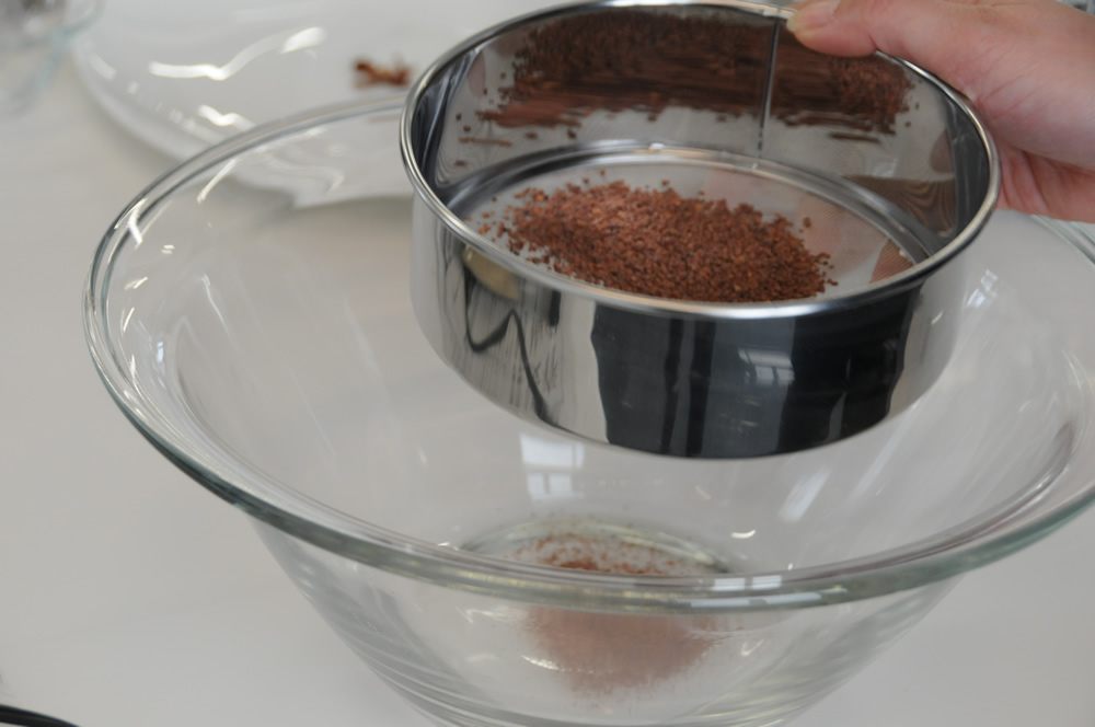 殻を剥いたカカオ豆を4~6回に分けてフードプロセッサーで粉砕し、更にふるい器にかけてを繰り返します。