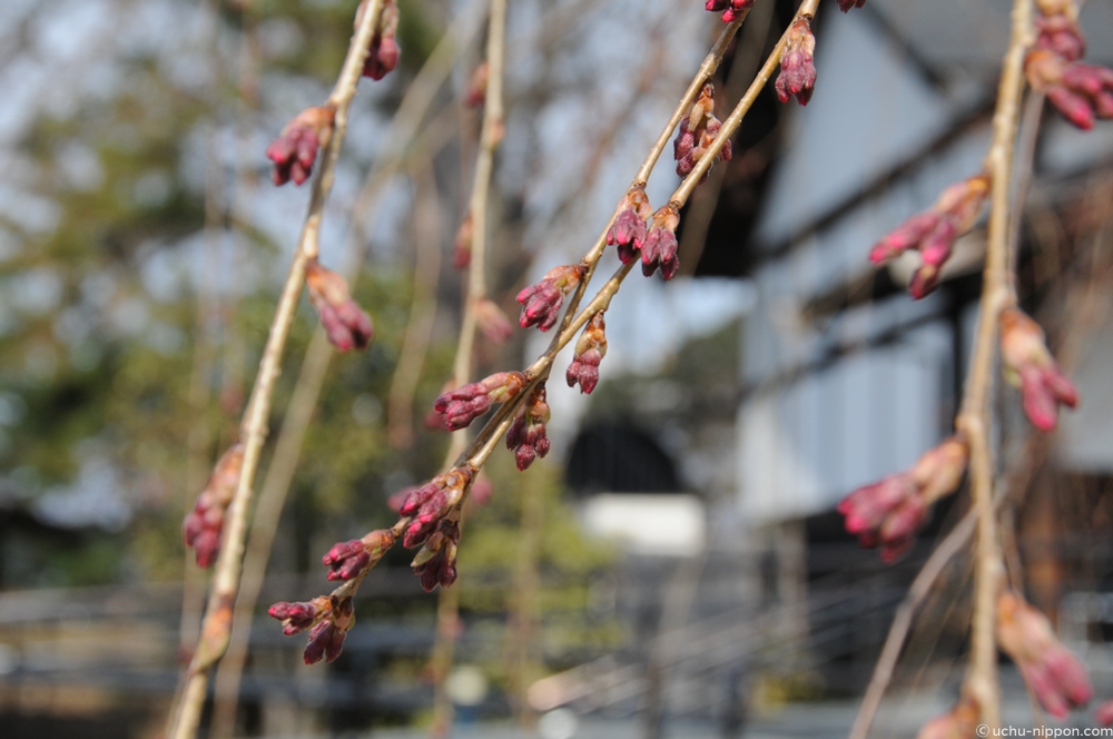 紅枝垂れ桜は、全体的にピンクの蕾が幾つも大きくなっています。