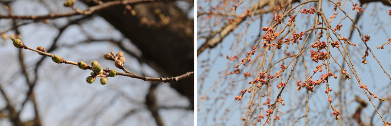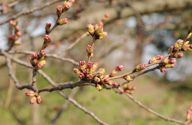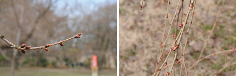 桜の蕾は、日当たりの良い所と日が当たりにくい所で膨らみに大きく差が出てきたと、