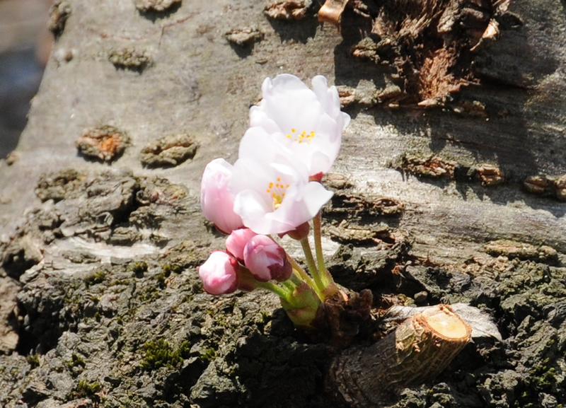 木の幹に咲く「胴吹き桜」、花開いているものがいくつか見られました。