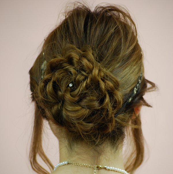 編み込みを少し崩してお花風にアレンジしたスタイルは、エレガントにもカジュアルにも合う、大人かわいいアップスタイルです。
